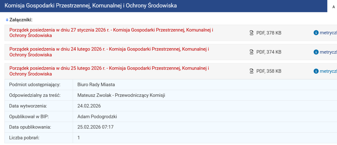 25 lutego 2026 roku mieszkańcy Bydgoszczy mieli teoretycznie możliwość uczestnictwa w posiedzeniu Komisji Gospodarki Przestrzennej, Komunalnej i Ochrony Środowiska. Posiedzenie zaplanowano na godzinę 8:40 w sali 203 ratusza. To komisja Rady Miasta Bydgoszczy, której prace śledzimy. Opiniowane są na niej kwestie związane z ustanawianiem i znoszeniem pomników przyrody oraz planowaniem przestrzennym.
