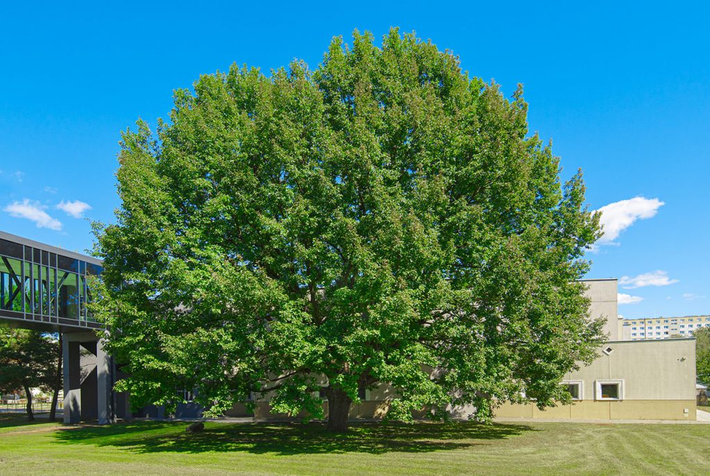Drzewo ma niezwykłą sylwetkę: jego pień rozgałęzia się nisko, nadając mu charakterystyczny, przysadzisty wygląd. Potężna, szeroka korona przybiera formę kulistej kopuły. Jesienią, kiedy liście zmieniają barwy na złoto i czerwień, a słońce przenika przez gęste konary, dąb staje się świetlistą kulą – naturalną ozdobą przestrzeni akademickiej.