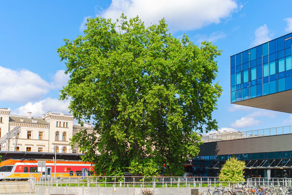 Trudno go nie zauważyć. Rośnie między starym a nowym gmachem dworca – jakby spinał przeszłość i teraźniejszość. Jego biała, łuszcząca się kora i potężna, rozłożysta korona sprawiają, że rozpoznacie go z daleka. Jesienią żółto-pomarańczowe liście rozświetlają okolicę. Platan towarzyszy podróżnym od pokoleń – wita i żegna ich od dziesiątek lat. To pomnik przyrody.