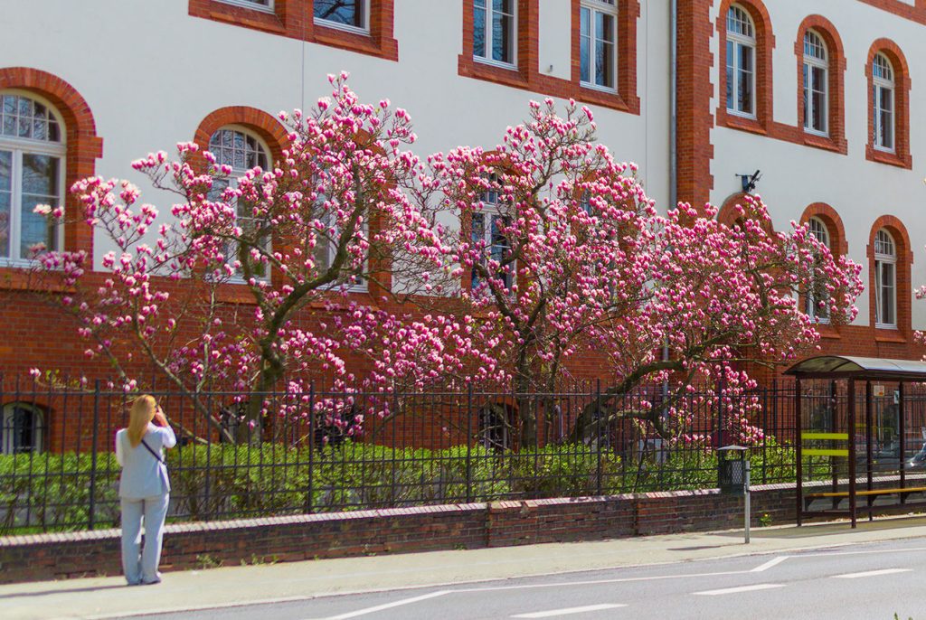 Magnolia jak z obrazu – krnąbrna, jakby skręcona w tanecznym geście, o gałęziach biegnących w zaskakujące strony. A gdy zakwita, olśniewa wielkimi, pachnącymi kwiatami. Dla bydgoszczan to niezawodny znak, że wiosna już nie ustąpi. Czasem, niczym kapryśna dama, potrafi zakwitnąć także w sierpniu, by zaskoczyć przechodniów.