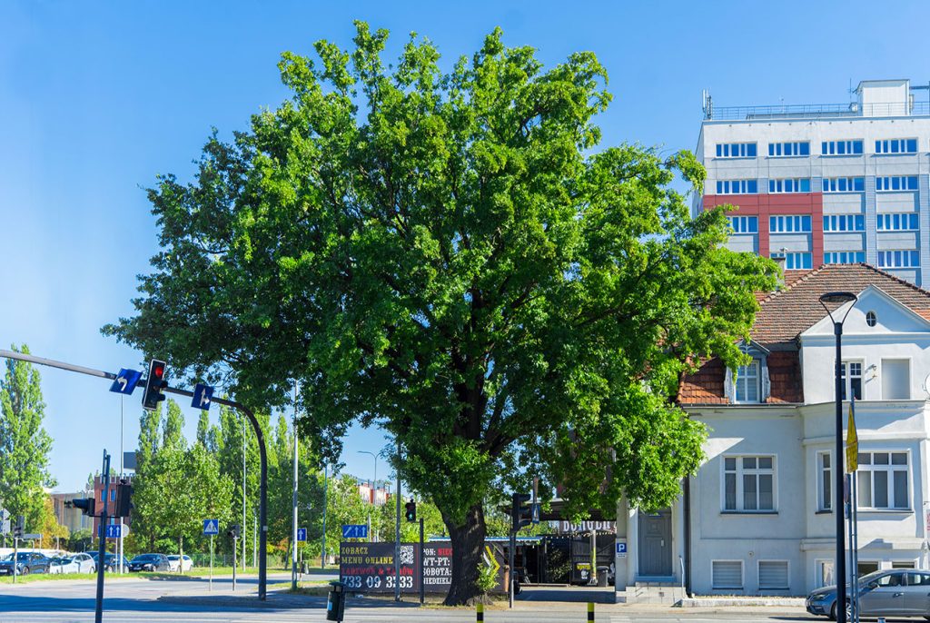 Na skrzyżowaniu ul. Ogińskiego i Moniuszki od ponad 120 lat stoi potężny dąb szypułkowy – strzelisty, rozłożysty, jakby wyrósł z ilustracji dawnej baśni. Od dziesięcioleci daje cień tym, którzy czekają tu na światłach. Jego gęste liście tworzą zielony parasol, a jesienią obsypuje chodniki żołędziami. Masywny i regularny pień drzewa, przypomina o długim życiu zapisanym w słojach, a rozłożyste konary rozciągają się szeroko nad ulicą, jakby otulały przechodniów ramionami. Jest niczym strażnik skrzyżowania, świadek codzienności i milczący towarzysz mijających pokoleń.