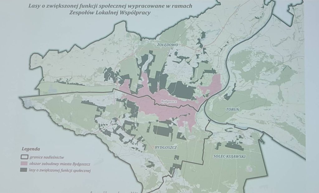 Zespół ma do końca października wskazać obszary lasów społecznych. Jako zespołowi podczas wczorajszego spotkania przekazano nam, że takie lasy będzie można wyznaczyć na obszarze nadleśnictw: Bydgoszcz, Żołędowo, Solec Kujawski, Gniewkowo, Cierpiszewo, Dobrzejewice, Toruń. Nie ma na tej liście Nadleśnictwa Różanna, pod które podlegają lasy leżące w Samociążku czy nad Jeziorem Koronowskim. O to dlaczego lasy społeczne zostały już na wstępie ograniczone do obszarów bezpośrednio sąsiadujących z miastem będziemy jeszcze pytać.
